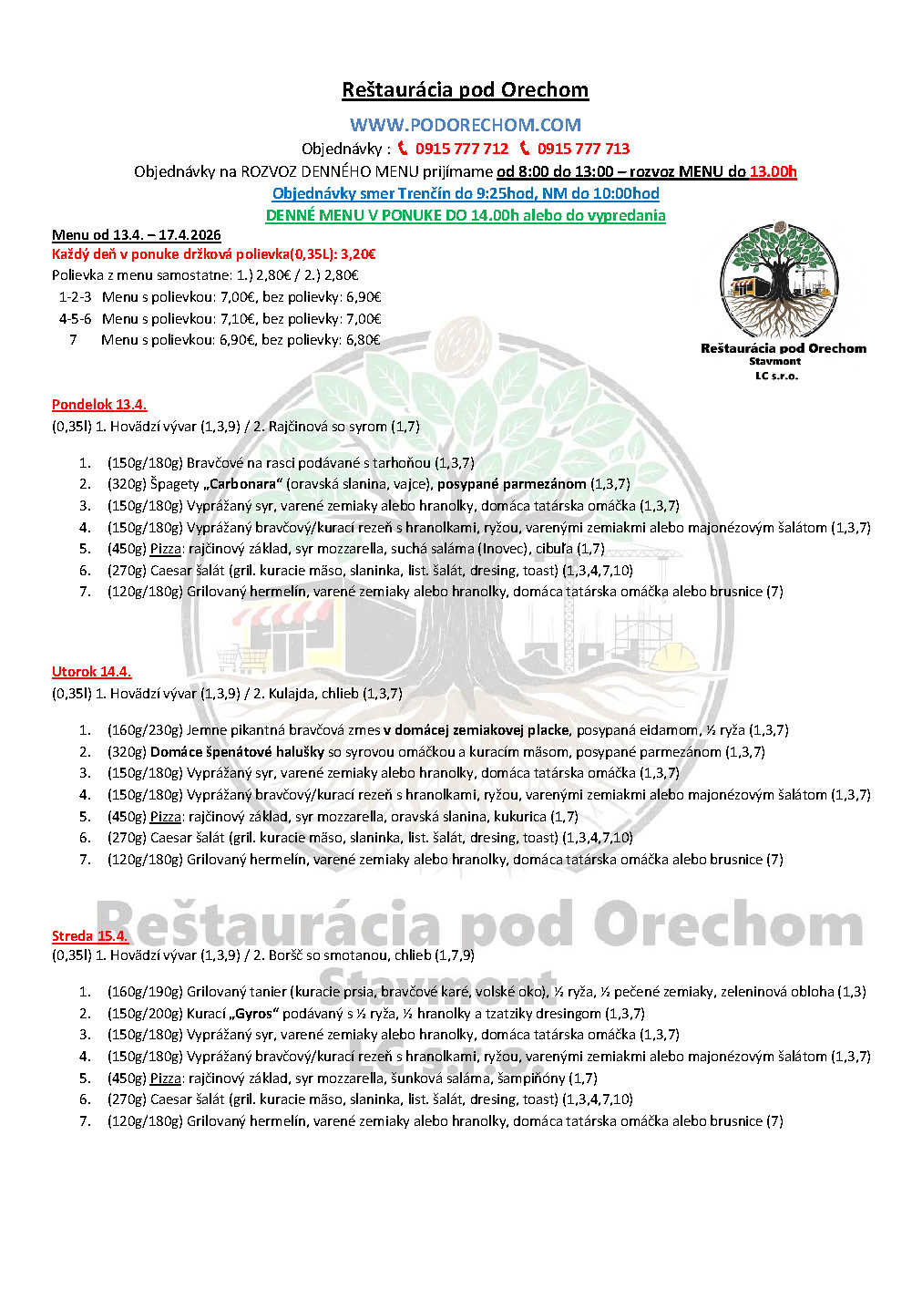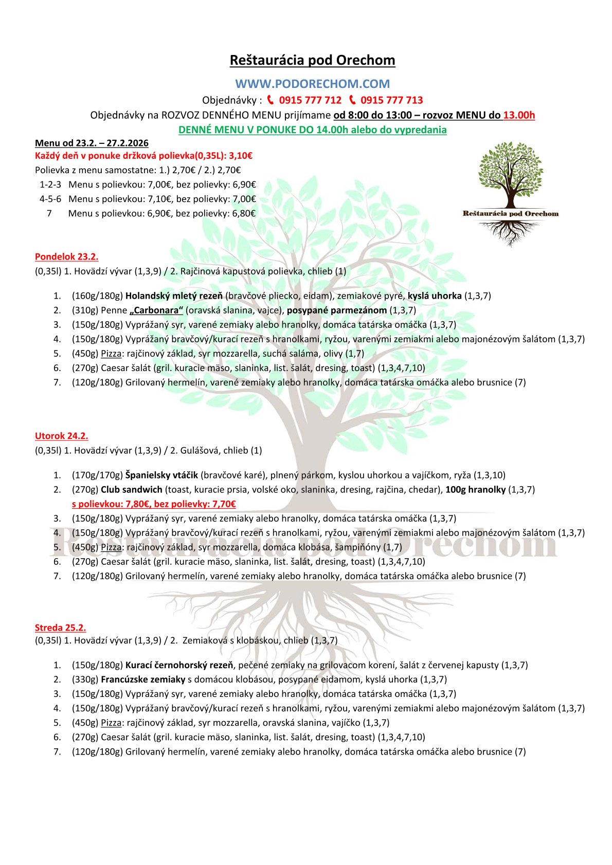 ROZVOZ TÝŽDENNÉHO MENU: objednávky: 0915 777 712 alebo 0915 777 713