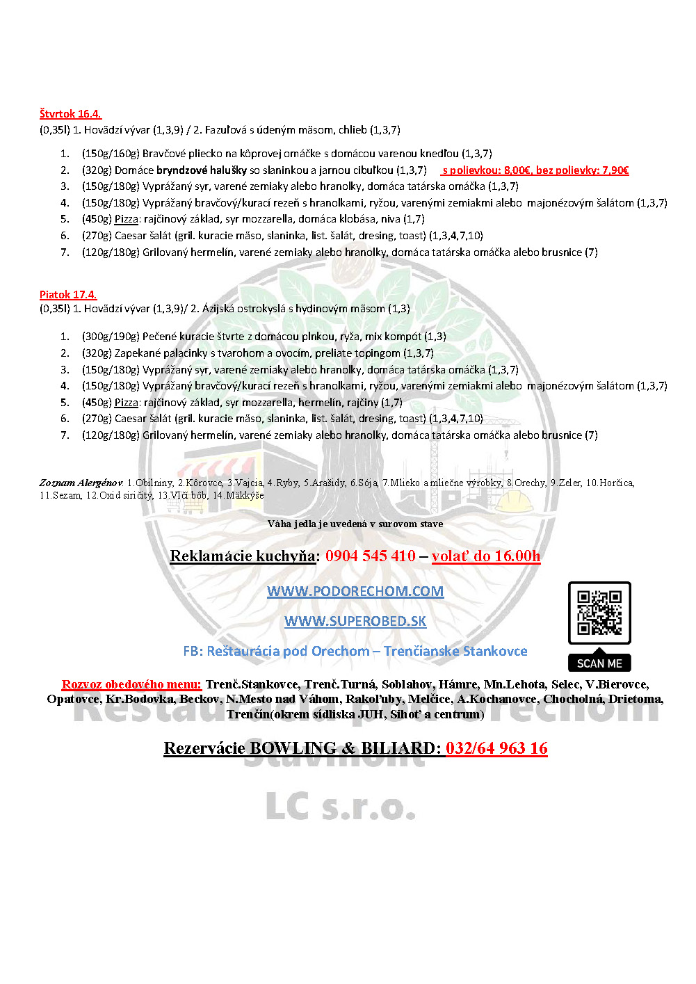 Čas dovozu MENU sa môže predĺžiť podľa vyťaženia kuchyne aj na 1 hodinu!!!